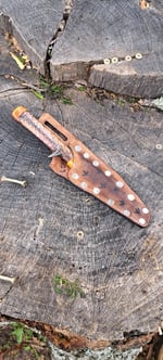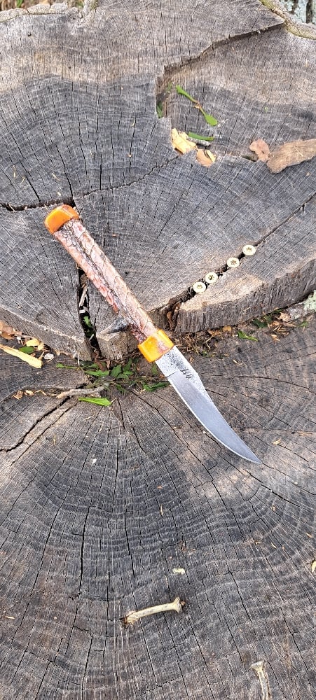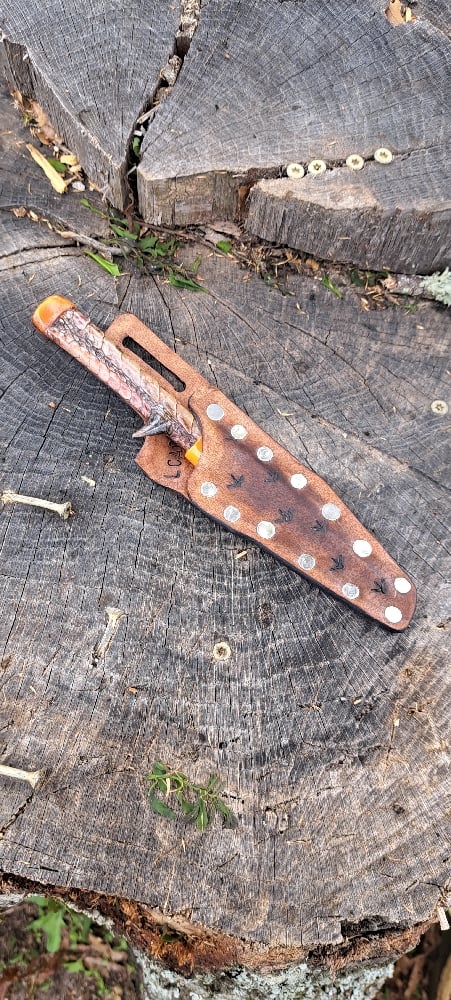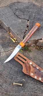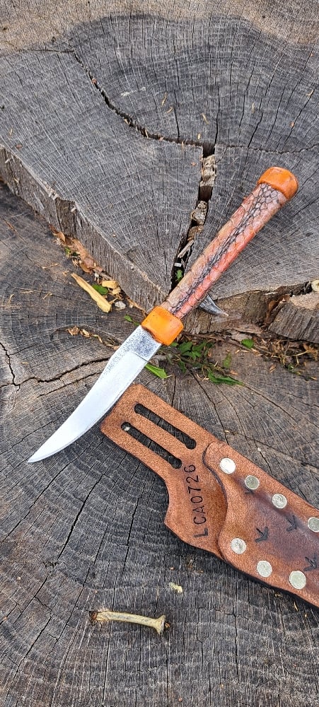 Handle- the handle is made out of a genuine turkey leg. Dried and stabilized on the ends with orange glow in the dark epoxy. Its a sporty peice and ready to for work!